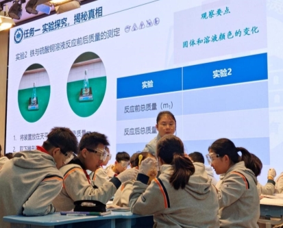 活动在浓厚的学术氛围中拉开帷幕。课例展示环节,首先是竹山中学的教师代表詹敏老师呈现了一节以“整体性教学”为导向的初中化学示范课《质量守恒定律》。该课以“吉林大安风光制绿氢合成氨”这一真实科技项目为情境导入,引导学生通过“铜粉与氧气反应”等实验进行探究,从微观角度理解本质,并运用定律推测物质组成与解释现象。教学贯穿“情境-探究-解析-应用”主线,旨在让学生在实践中理解质量守恒定律,锻炼学生解决真实问题的能力。教学过程充分体现了理论联系实际的教学理念,引发了参会教师的深入思考。