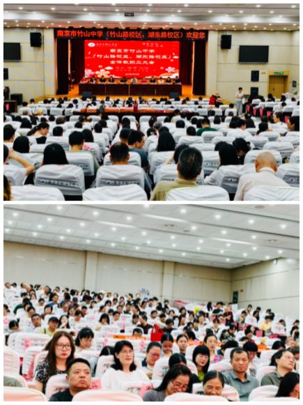 在两校区校长室的安排下,2025年6月30日下午2:00,竹山中学在报告厅召开了两校区全体教职工大会。